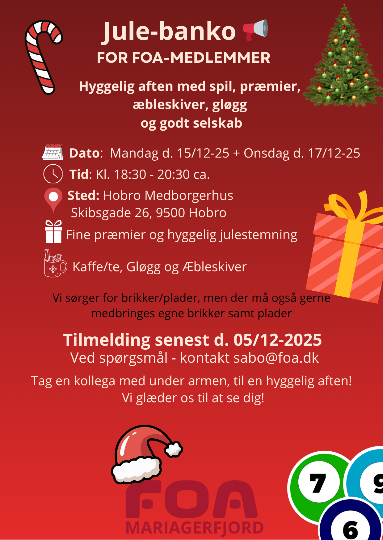 Læs op Udskriv Julebanko for medlemmer Del på Facebook Del på X Send som mail Praktiske oplysninger Tid: 15-12-2025 18:30 til 17-12-2025 20:30 Sted: Hobro Medborgerhus, Skibsgade 26, 9500 Hobro Målgruppe: Medlemmer Vi vil gerne sprede lidt juleglæde og inviterer derfor vores medlemmer til julebanko! Kom og vær med til en hyggelig aften fyldt med gode præmier, julehygge og samvær med kolleger og venner. Dato: Mandag d. 15/12-2025 + Onsdag d. 17/12-2025 Tid: 18:30 - 20:30 (Eller indtil spillet er færdigt) Sted: Hobro Medborgerhus, Skibsgade 26, 9500 Hobro Der vil være kaffe/te, gløgg og æbleskiver og naturligvis masser af julestemning. Tilmelding sker senest d. 05/12-2025 på følgende links: Tilmelding til d. 15/12-2025: Klik her Tilmelding til d. 17/12-2025: Klik her OBS! Det er kun muligt at tilmelde sig den éne aften på de pågældende datoer, da vi ønsker at så mange som muligt får muligheden for at kunne deltage. Tilmelding sker efter først-til-mølle-princippet. Vi glæder os til at se jer til en hyggelig aften!