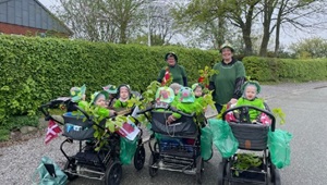Dag 2. var selve Dagplejens dag. Dagplejerne havde pyntet barnevogne med bøgegrene, klistermærker, flag, grønne affaldsposer til skral vi samlede op på turen.