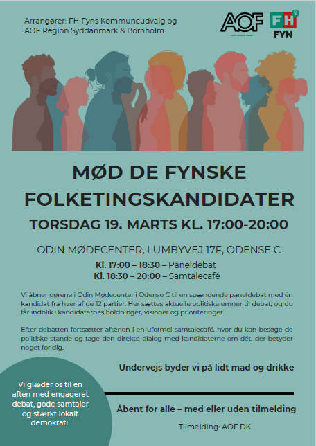 Læs op Udskriv Mød de fynske folketingskandidater Del på Facebook Del på X Send som mail Praktiske oplysninger Tid: 19-03-2026 17:00 til 20:00 Sted: Odin Mødecenter, Lumbyvej 17F, 5000 Odense C Målgruppe: Alle er velkomne FH Fyn og AOF inviterer til debat med de fynske folketingskandidater: Tilmelding på www.aof.dk
