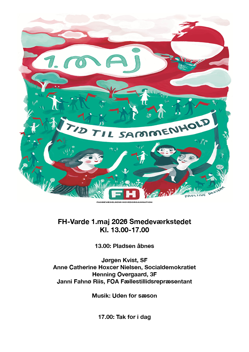 Læs op Udskriv 1. maj i Smedeværkstedet i Varde Arbejdernes internationale kampdag - 1.maj - bliver fejret i Smedeværkstedet i Varde, hvor blandt andet FTR Janni Fahnø Riis taler. Del på Facebook Del på X Send som mail Praktiske oplysninger Tid: 01-05-2026 13:00 til 17:00 Sted: Smedeværkstedet, Varde Målgruppe: Medlemmer af FOA Vest Når der 1. maj fejres i Smedeværkstedet i Varde bliver det Jørgen Kvist, SF, Anne Cathrine Hoxcer Nielsen, Socialdemokratiet, Henning Overgaard, forbundsformand i 3F og FTR i FOA VestJanni Fahnø Riis der går på talerstolen. Musikken er med "Uden for sæson." 1. maj festen begynder finder sted klokken 13.00 - 17.00.