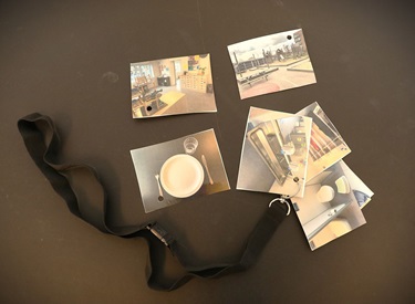 Der var billeder af institutionens toiletter, håndvaske, garderobe, udendørs legeområde, indendørs legeområde samt af en flyverdragt med dertilhørende gummistøvler og en tallerken med service og glas. Alle de aktiviteter, som en almindelig hverdag i en institution består af, men som personalet ikke kunne forklare hverken verbalt eller kollektivt.