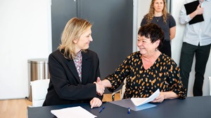 FOA-formand Mona Striib underskriver sammen med Lisbet Langbjerg Sørensen, der er kontorchef for KL's overenskomstområde. Foto: Signe Kaalund