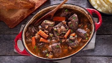 Nu brunes kødet godt, så det får en pæn skorpe. Gulerødder og løg tilsættes og svitses med et øjeblik. Mel drysses over, bouillon og krydderbuket tilsættes.Det hele bringes i kog og der skummes for urenheder. Læg låg på og lad retten simre ca. 3 - 4 timer.Nu renses champignon og ristes på en pande, de puttes i retten og koger med nogle minutter før retten er færdig. Bacon ristes og drysses over retten lige før servering, til allersidst pyntes med et drys hakket persille.