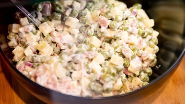 små tern. Ærterne blancheres. Tomaterne skæres også ud i tern. Æggene hakkes, halvdelengemmes til pynt. Alle ingredienser placeres på store fade eller i skåle. Dressingen røres sammenog vendes i salaten sammen med persille.Til sidst pyntes salaten med de resterende æg og den gives et drys af persille.Serveres med syltede agurker og brød.