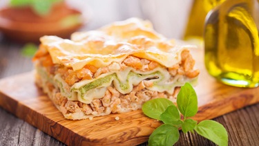 Serveres med grønne ærter og en grov bolle.Lasagnen smager også godt med andre grønsager f.eks. spinat og spidskål.